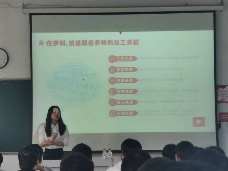 宣讲伊始,湖北黄冈伊利乳业有限公司倪专员通过播放暖场视频和企业介绍视频,通过有奖提问让毕业生慢慢的减弱了陌生感,对公司开始有了亲近感。随后,该经理从企业文化、企业地位、公司优势、人才培养、就业地点等方面进行进一步的讲解,通过与员工互动提问,知识竞答等形式逐步拉进与员工关系。最后介绍了生活环境,食宿管理制度等企业情况并就大家关心的薪资待遇、福利保障和企业需求等方面重点进行介绍。