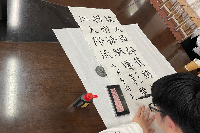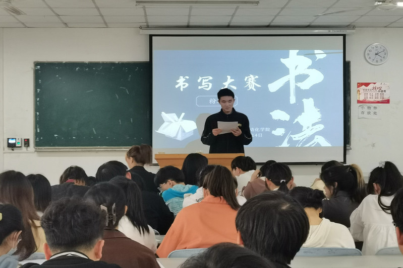 在主持人宣读完比赛规则及评分标准之后,比赛正式开始,选手们现场随机抽选书写篇目。粉笔字赛场上,每四名参赛选手为一组同场竞技,选手们纷洒挥扬,尽情展示自己的才华。毛笔字赛场上,选手们控笔稳健、走笔龙蛇,现场铺呈一幅幅优秀笔墨。比赛结束后,评委们对参赛作品进行评分,王梦茜总结讲话,她引导同学们要热爱祖国文字和书法艺术,继承和弘扬中华优秀传统文化。本次比赛选出粉笔字一等奖朱先珺、杨文静两名同学,毛笔字一等奖周天俊同学,至此比赛圆满结束。