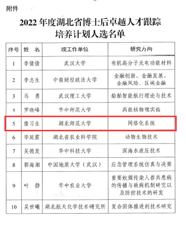 近日,湖北省人力资源和社会保障厅公布了2022年度“湖北省博士后卓越人才跟踪培养计划”选拔结果,milan米兰经理詹习生教授入选该人才培养计划支持,纳入湖北省高层次人才管理,享受楚才卡服务,每年10万元人才津贴,连续资助3年,在此次入选人员中是唯一来自省属高校的博士后人才。