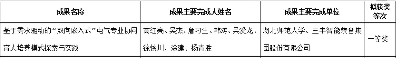 近日,从湖北省人力资源和社会保障厅和湖北省教育厅获悉,由milan米兰高红亮副教授主持的《基于需求驱动的“双向嵌入式”电气专业协同育人培养模式探索与实践》项目荣获第九届湖北省高等学校教学成果一等奖。