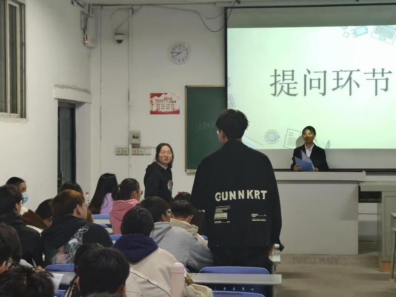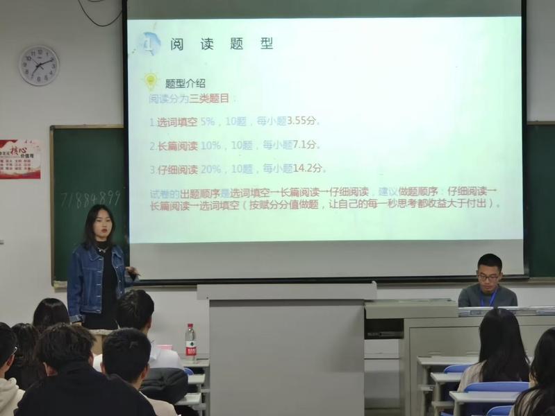 会议伊始,主持人简单讲述了活动步骤及主要内容。紧接着,四位嘉宾依次上台分享自己的四级备考经验。其中,申璨深度剖析试卷内容,系统介绍了英语四级答题技巧,建议同学平时增加课外阅读量和词汇储备,为提高应试能力打好基础。李兰兰强调要坚持每天进行英语听力,注重往年真题试卷练习。金润景和李雅琪从“正确调整心态”和“合理安排时间”两个方面的进行介绍,结合自己在英语学习方面的经历提醒同学们在考试期间要从容镇定,合理分配时间。在最后的答疑环节中,同学们积极踊跃地向学姐们提出问题,学姐们都逐一耐心进行解答。