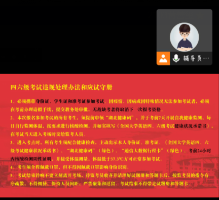 本次会议于122日晚七时在线上准时开展。辅导员黄新望围绕英语四六级违规处理办法和应试守则进行考前统一教育,他强调​milan米兰各参考年级的考生要在落实疫情防控的基础上进行备考并准时参加考试,要严格按照疫情防控要求进行核酸检测和体温检测并全程佩戴口罩。同时,参考员工要积极备考,严格遵守考试纪律,不得有抄袭舞弊的现象。低年级员工和未报名英语四六级考试的大二、大三员工可在进行核酸检测之后正常离校进行线上授课。随后,针对正在进行考研备考的大四员工,他鼓励员工积极备考,在最后的冲刺期鼓足干劲勇往直前,祝愿他们考出好成绩。最后,黄新望老师对各级员工提出的有关备考和离校的问题也一一进行解答。