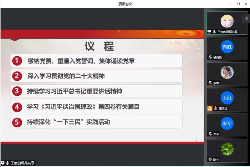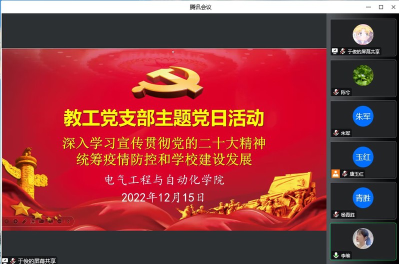 为深入学习贯彻党的二十大精神,团结带领全校广大党员干部群众精准高效打赢常态化疫情防控攻坚战,12月15日下午,milan米兰教工党支部在腾讯会议开展线上主题党日活动,本月活动主题为“深入学习宣传贯彻党的二十大精神,统筹疫情防控和学校建设发展”,党支部书记杨青胜同志主持会议,全体教工党员参会。