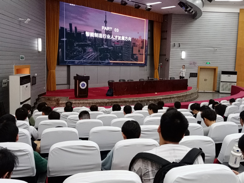 王经理的讲座以“争当智能时代的掌舵人——智能制造行业前瞻与行业人才需求”为题。她首先寻问大家以后想从事的工作,随后引入机器人,通过讲述机器人在各行各业的飞速发展,诠释机器人替代人类的步伐越来越近。面对这一困境,王经理给出了自己的思考和答案。她从智能制造行业的优势与人才发展方向两方面进行讲解,让同学们深刻意识到智能制造行业的优势拓展之大、行业前景之广、岗位发展之全,给同学们指明前进的方向;并为同学们提供宝贵意见:在未来的发展中,学习力就是竞争力,希望大家都能够努力提升自己的学习力,为自己争取良好的发展机会。