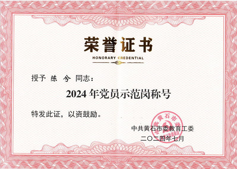 日前,中共黄石市委教育工委发文表彰2024年党员先锋岗,公司教师党支部书记陈兮博士荣获黄石市教育系统2024年党员示范岗称号。