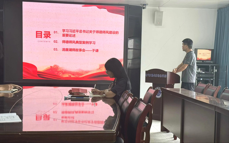 在专题党课环节,涂建同志进行“以案说德”师德师风教育宣讲。他向大家宣讲了习近平总书记在2024年全国教育大会上所做的重要讲话,讲述了时代楷模钟杨的优秀事迹,分享了中国历史上明朝著名的政治家、军事家于谦的故廉政事,并结合高校教师发表不当言论、师德失范等行为的反面案例警示广大教师党员同志要做以德修身、以德立学、以德施教、以德育德的楷模。