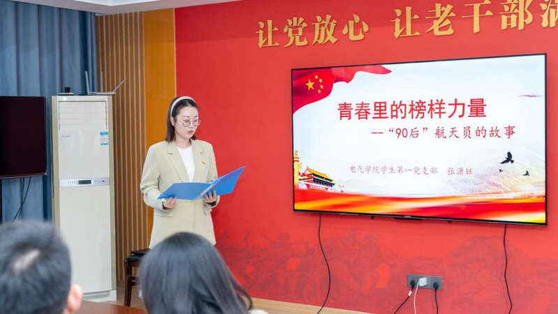 在特色党课环节,张潇钰讲述了青春里的榜样力量——神舟十九号“90后”航天员的故事。为庆祝中华人民共和国成立75周年,刘畅、王海港、马毓婉、张会敏等4人朗诵了《诗意中国》,激发青年党员的历史责任感与使命感,点燃胸中的“爱国心”。
