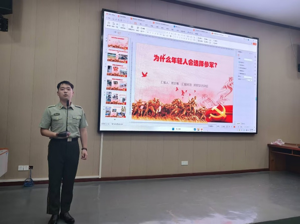 紧接着,优秀退役士兵邓文博以“年轻人为什么选择参军”为切入口,分享军营收获并给出建议;刘晓维从端正入伍动机出发,讲述入伍前、入伍时、退役后的成长经历,让员工了解参军带来的改变。