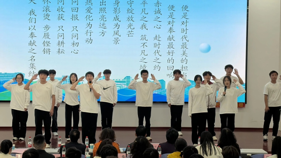 经典诵读环节,团学青各部门成员携手演绎《以奉献之名,赴时代之约》。朗朗诵读声中,大家感悟经典内涵,传递奉献情怀,进一步坚定了以青春之我、担时代之责的信念。